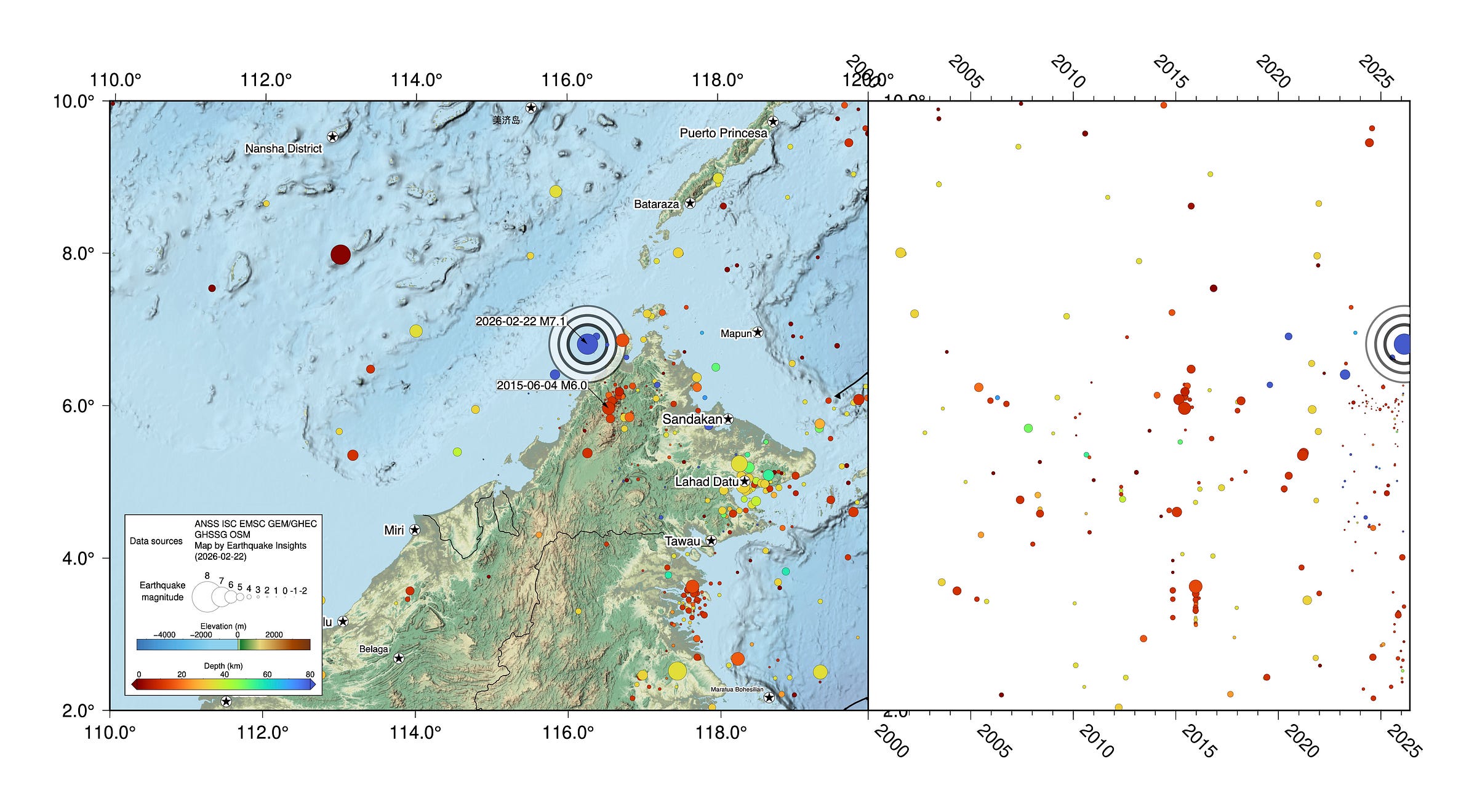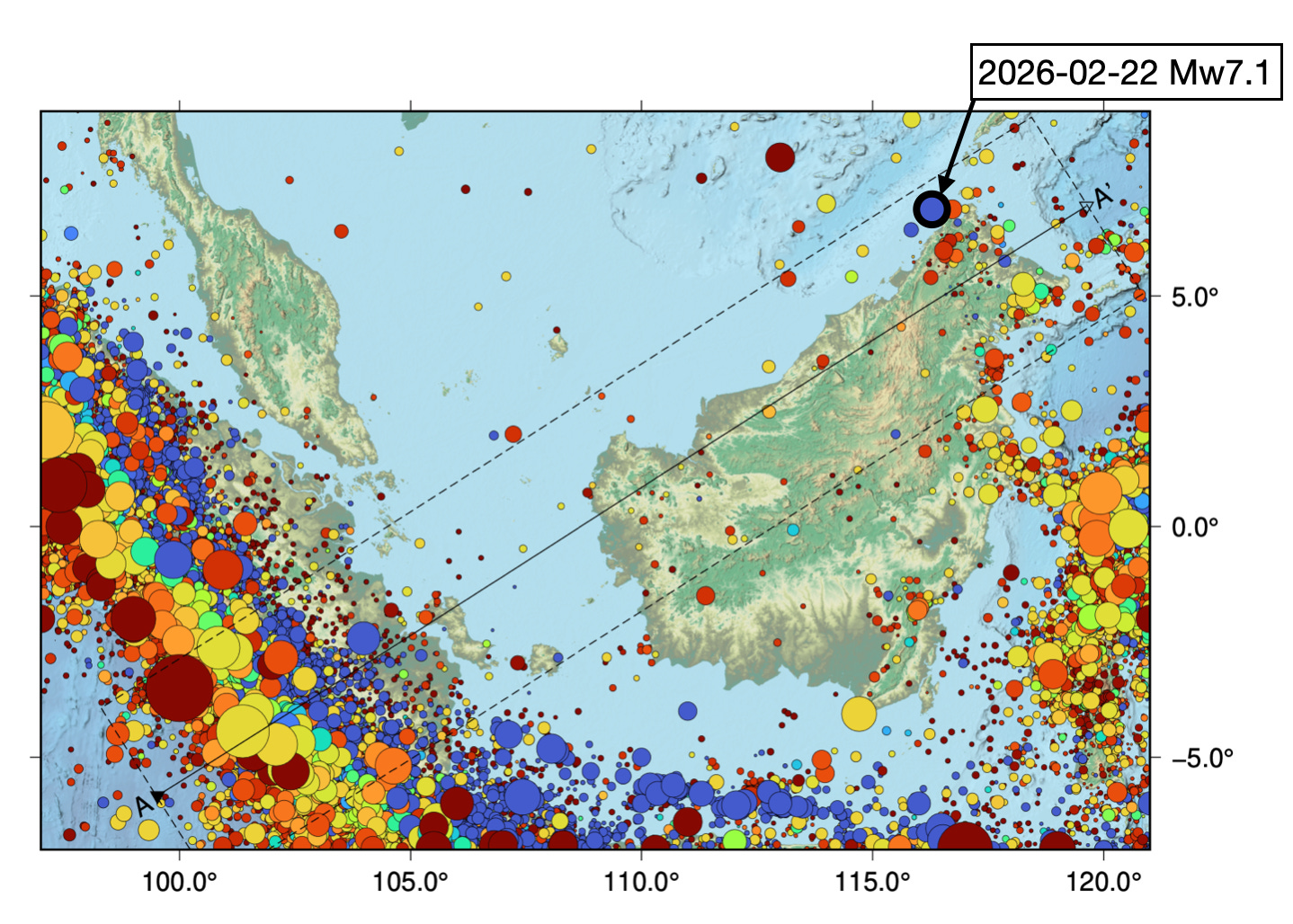 Most earthquakes in and around Sabah occur at shallow depths, as we were reminded by the deadly 2015 M6.0 Sabah earthquake, which occurred very close to the recent M7.1 in map view, but was actually more than 600 kilometers away due to the difference in depth. Fortunately, the extremely deep earthquakes like today’s event are mainly intellectual stimulators, and not societal devastators.