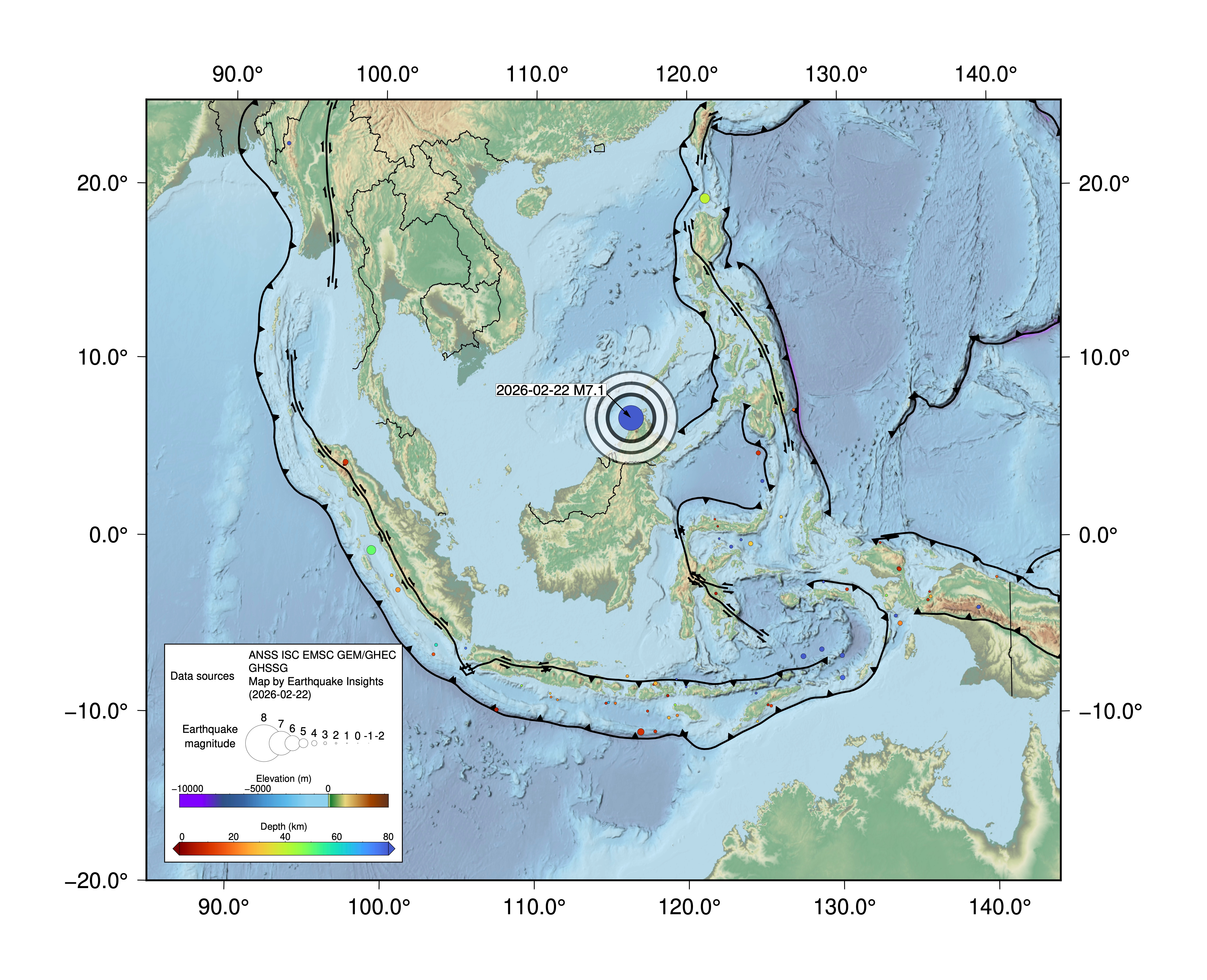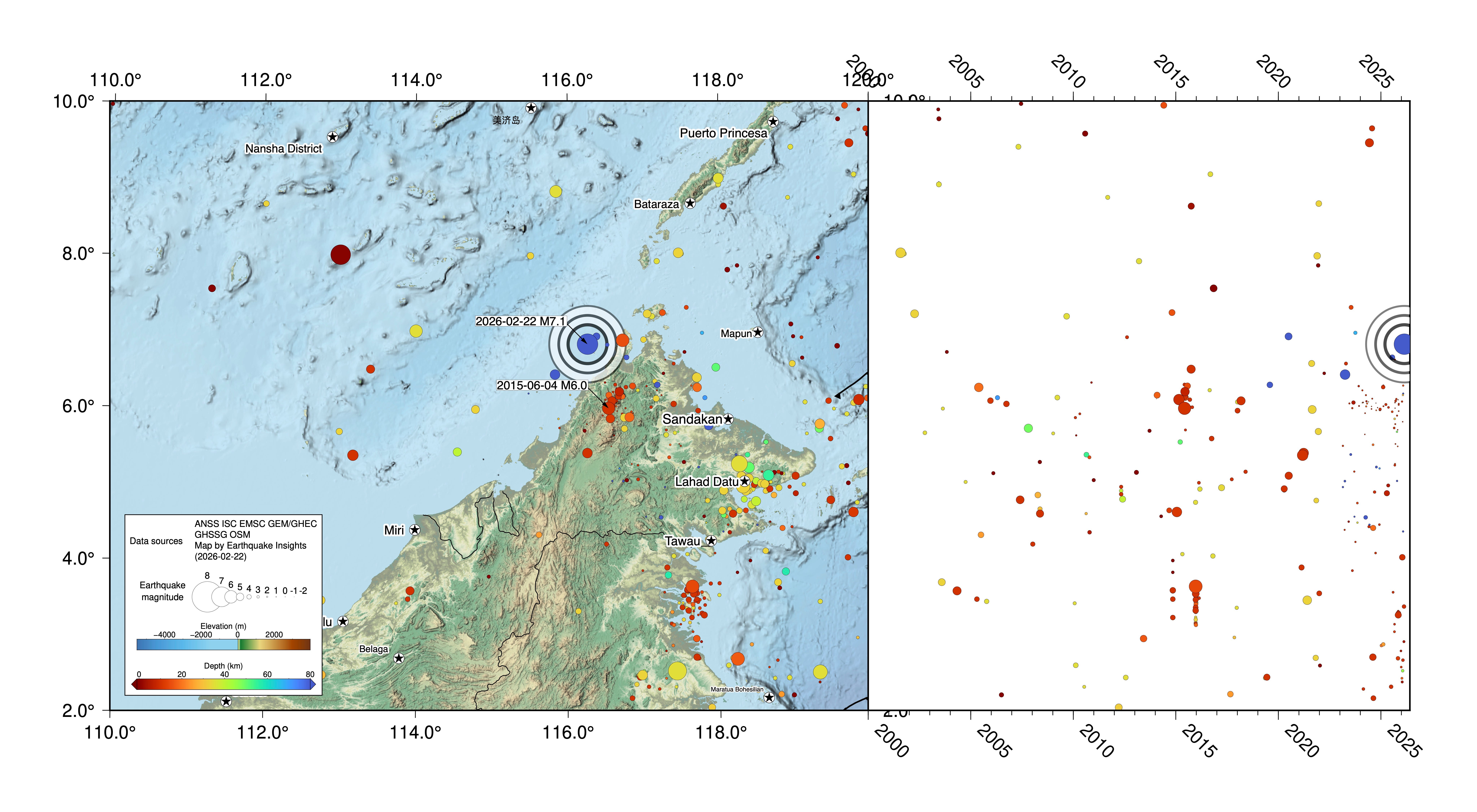 A magnitude 7.1 earthquake struck below Sabah, Malaysia on February 23rd at 12:57 AM local time (February 22nd UTC).