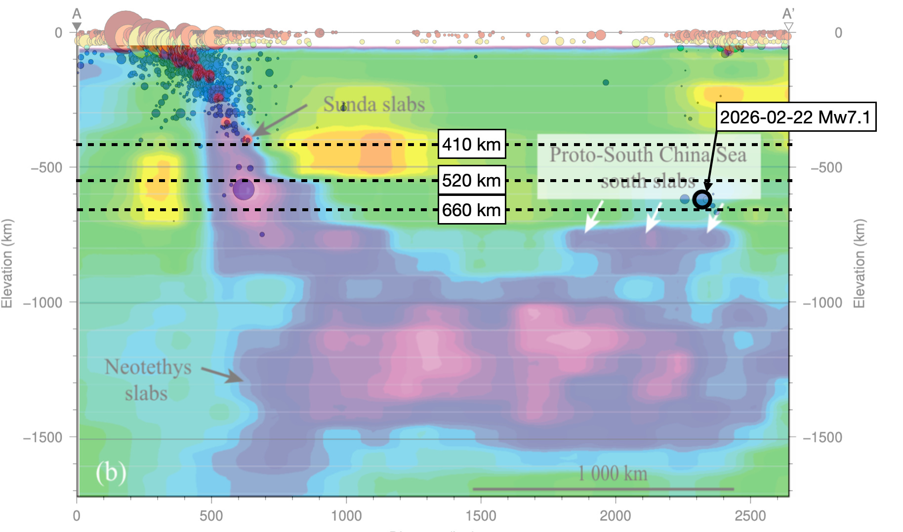In any case, today’s deep earthquake is surely related to some past subduction, whether of the Proto-South China Sea or some other now-lost ocean basin. Regardless of the exact origin of the blue blobs at depth, there is clearly still at least a little seismic potential remaining at these great depths. Over time, as these deep slabs equilibrate to their surroundings, they will inevitably go seismically quiet. However, by that time, new slabs that are still seismically active will probably have joined that great graveyard in the mantle.